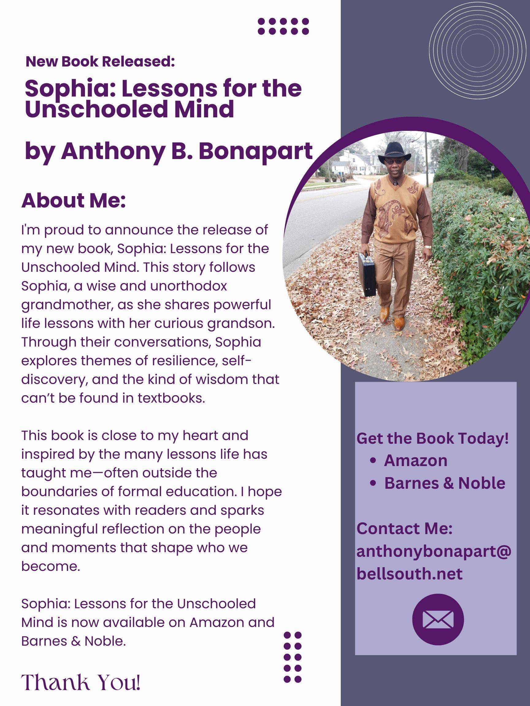 Bring Sophia: Lessons for the Unschooled Mind to life by inviting Anthony B. Bonapart to your bookstore, library, school, or organization for an engaging book signing event. As an award-winning leader and thought-provoking author, Anthony offers meaningful conversations, personal insights, and a dynamic presence that resonates with readers of all backgrounds.